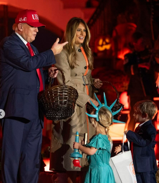 Los jardines del ala sur lucieron irreconocibles: hileras de calabazas iluminadas, coronas de espantapájaros y un camino de luces guiaban a los pequeños disfrazados hasta el punto más esperado del recorrido: el momento de recibir sus dulces de manos del presidente y la primera dama. Melania, fiel a su elegancia, escogió un abrigo marrón que contrastaba con el tono naranja de su vestido, mientras Trump, en su habitual estilo, lució un traje azul marino y su gorra con las iniciales “USA”.