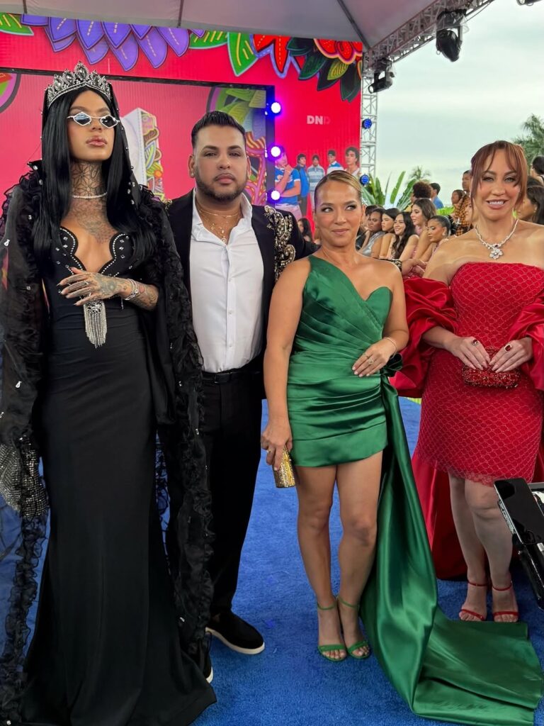 Tenay Rodríguez se mantuvo como una de las apariciones más memorables. Lució un vestido rojo despampanante y original strapless con textura de diamante y mangas voluminosas en satén brillante, complementado con joyería plateada floral. Su elección proyectó fuerza escénica, elegancia moderna y una presencia que no pasó desapercibida entre los flashes y cámaras.