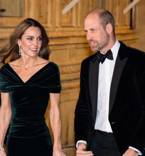 Para esta gala, Kate eligió un imponente vestido de terciopelo en tono verde profundo, una creación de silueta elegante que destacaba por su caída fluida y un delicado drapeado integrado al diseño, generando el efecto visual de un chal sobre los hombros.